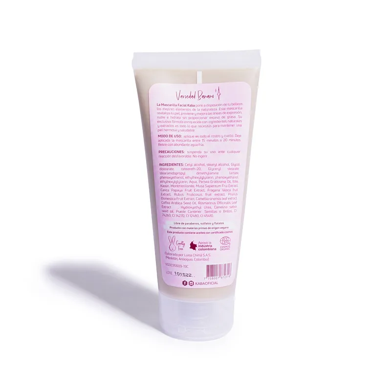 La Mascarilla Facial de Banano Kaba destaca por sus propiedades regenerativas que corrigen imperfecciones dejando la piel más suave uniforme y revitalizada gracias al aporte de vitaminas del banano Modo de uso aplicar sobre el rostro limpio dejar actuar unos minutos y enjuagar Bien para revelar una piel tersa y fresca